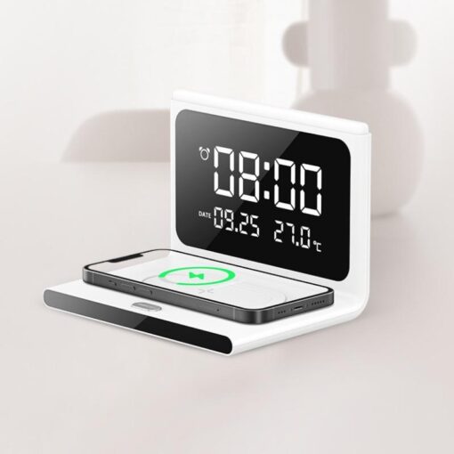 - Fonctions Multitâches Intégrées : Inclut un réveil, un affichage de la date, de l’heure, et de la température, ainsi qu’une veilleuse, offrant une utilité au-delà de la simple recharge.